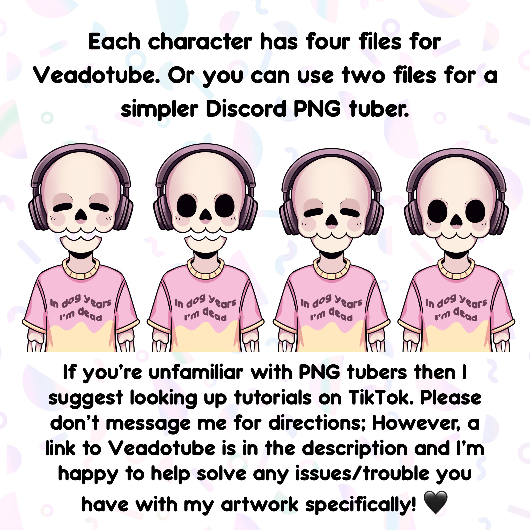 - You will receive a zip file containing 7 skeleton PNG Tubers (28 pngs total)